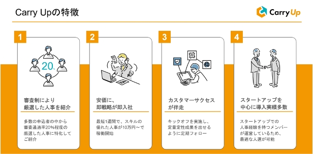 ONXが運営する「Carry Up( https://company.carry-up.com/lp2 )」とは、企業とプロ人事の間でマッチングサポートをするサービスです。IT企業に特化しており、即戦力かつミスマッチの少ない人材をご提案します。ご利用企業は、現状お抱えの課題ヒアリング後、業務委託もしくは正社員の人事人材の提案、面接を経て決定し、最短1週間でプロ人事を採用することが可能です。
